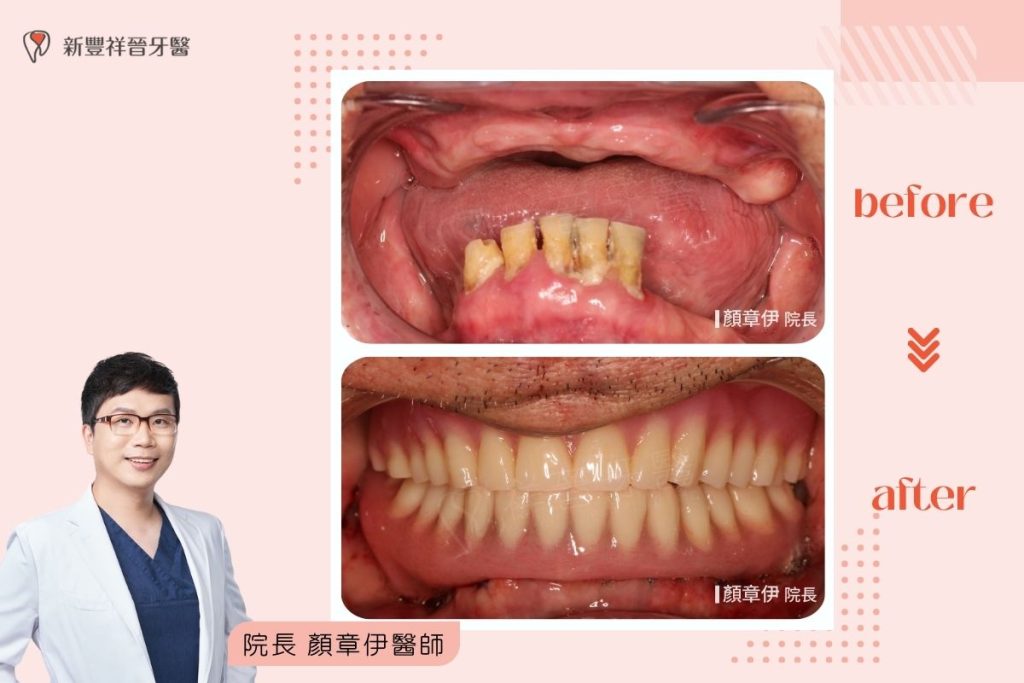 顏章伊院長透過高效的「一日長城」術式,移除不堪使用的病牙,並在當天精準植入人工牙根與固定假牙。